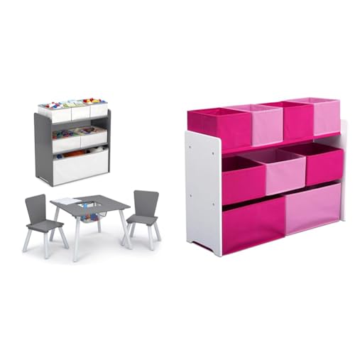 Product 1: REUSABLE STICKERS: Kids will love arranging the reusable vinyl cling stickers to the sides of this toy organizer to create a new story every time they playProduct 2: Recommended for ages 3 to 6Product 2: Made of engineered wood, solid wood and fabricProduct 2: Features (4) small, (3) medium and (2) large binsProduct 2: Assembled dimensions: 36 L x 11.81W x 28 H inches. Easy assembly