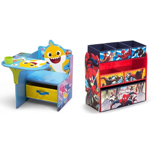 Features colorful Baby Shark graphics and a built-in cup holder ideal for art supplies or snacksLow desk height and pull-out storage bin under seat provides easy access for kidsIncludes 6 fabric bins in 3 sizes on a Spider-Man toy organizer, offering ample storageSturdy construction of engineered wood withstands years of use by kids ages 3+Perfect for Baby Shark fans; recommended for up to 50 lbs