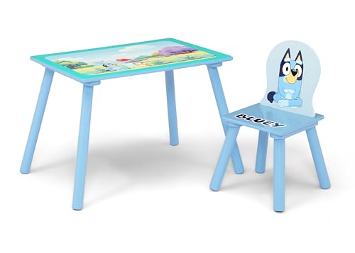 WHAT’S INCLUDED: This 4-Piece Toddler Room-in-a-Box Bedroom Set includes a Toddler Bed, Play Table, 1 Chair and Fabric Toy BoxFOR BLUEY FANS: Toddler Bed, Table, Chair and Fabric Toy Box feature colorful Bluey graphics your little one will loveDURABLE CONSTRUCTION: Made of plastic, engineered wood and solid wood | Scratch-resistant finish on table and toy box protects the colorful graphics | Easy assemblySAFE OPTION: All products in this set meet or exceed all safety standards set by the CPSC | Bed is JPMA Certified | The mattress is designed to sit low in the bed frame for your child's safety and ease (mattress sold separately)SIZE: Assembled dimensions: Bed: 29.5"W x 54.5"D x 17.5"H; Table: 24”W x 20”D x 17.5”H; Chair: 10.5”W x 10.25”D x 20.25”H; Fabric Toy Box: 19.5”W x 13.5”D x 13”H | Recommended for toddlers and kids ages 15 months+ | Chair holds up to 50 lbs.