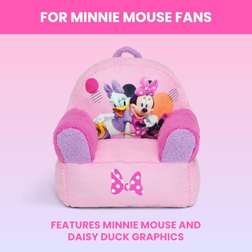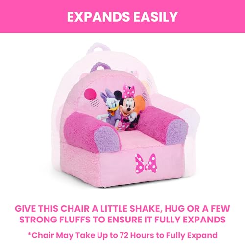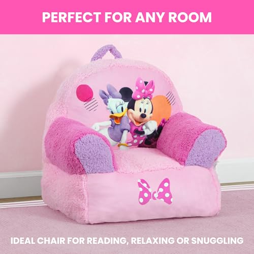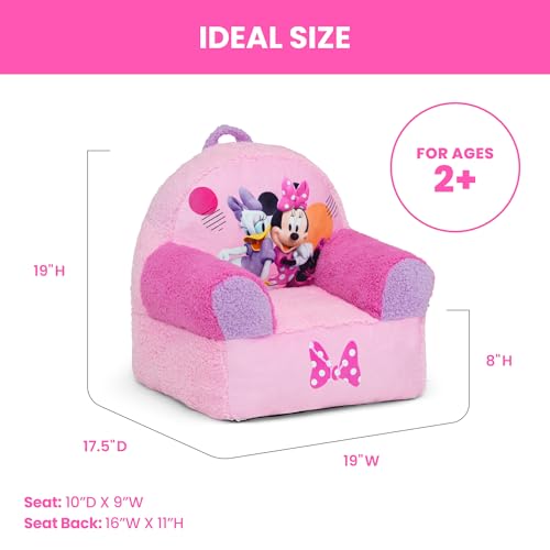 RECOMMENDED USE: This chair is ideal for toddlers and kids 2 years+FOR MINNIE MOUSE FANS: This plush chair features colorful Minnie Mouse graphics | This chair will be your child’s cuddly companion for reading, relaxing or snugglingPLUSH COMFORT: This cozy kids chair provides soft plush construction and contoured support in the ideal size for your little oneANYWHERE CHAIR: Lightweight design and convenient easy-to-grab handle makes this chair easy to move around the house | Perfect kids chair for the bedroom, playroom or living roomSIZE: 19"W x 17.5"D x 19"H| Seat: 10"D x 9"W | Seat Back: 16"W x11"H | Seat Height (from floor to seat): 8”H | Spot clean with soapy water | Chair may need some time to expand once unboxed | Give chair a little shake, hug or a few fluffs to ensure it looks it’s best before use