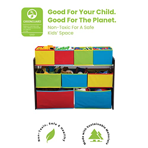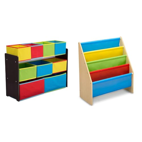 Delta Children Deluxe Multi-Bin Toy Organizer with Storage Bins & Sling Book Rack Bookshelf, 4-Tier Wooden Shelf with Soft Fabric Pockets, Ideal for Playroom, Living Room, Basement, or Bedroom