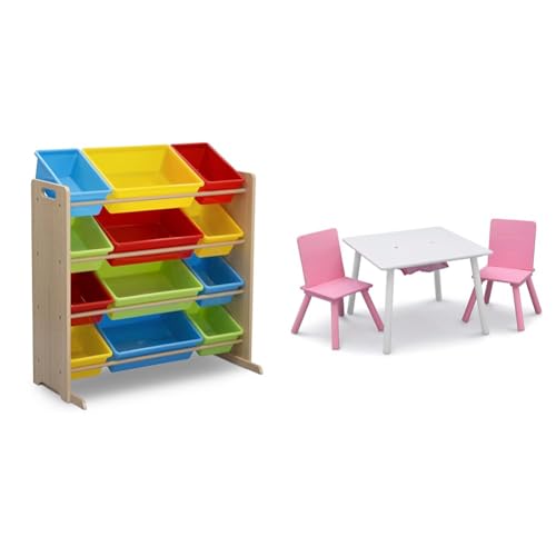 12 plastic bins in two sizes for ample toy storage, perfect for organizing playrooms or bedrooms.Durable wood construction with color options like White/Pink, Grey/Blue, or Natural/Primary to coordinate with kids' décor.Table and 2 chairs have a cool color block design and built-in storage compartment for art supplies or books.Recommended for ages 3+; organizer bins let kids easily access toys and playsets to spark creativity.Rigorously tested to meet or exceed all safety standards from trusted brand Delta Children.