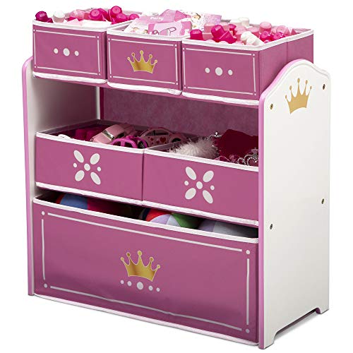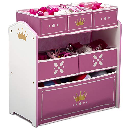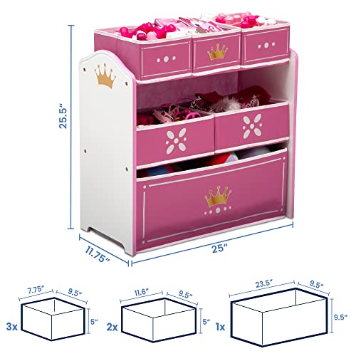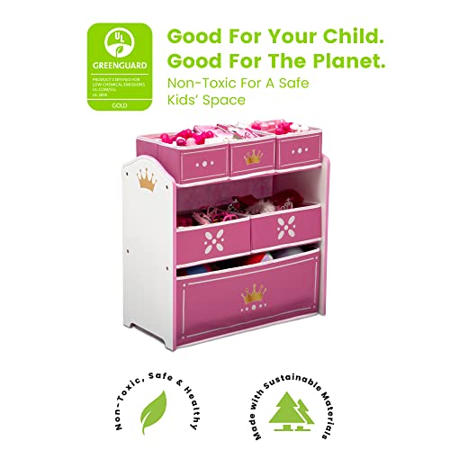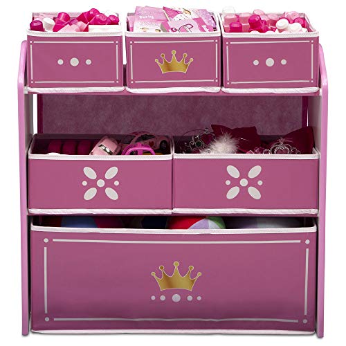 GREENGUARD GOLD CERTIFIED: This toy bin meets the most stringent chemical emissions standards to create a healthier home for your child. Tested for more than 10,000 chemicals and VOCs, this toy bin is certified to contribute to cleaner indoor airAGE RANGE: Recommended for ages 3+PRINCESS THEMED PERFECTION: This Multi-Bin Toy Organizer features metallic gold crown emblems and pretty, pink trim | Kids will love arranging the incldued reusable vinyl cling stickers to the sides of this organizer to create a new story every time they playWE PUT YOUR CHILD'S SAFETY FIRST: Bin meets or exceeds all safety standards set by the CPSC | Made of engineered wood, solid wood and fabricSIZE: Assembled dimensions: 24.61"L x 11.81"W x 26.57"H | Easy assembly