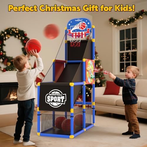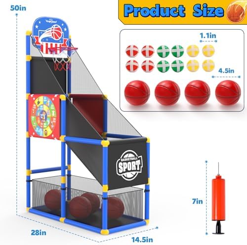 Adjustable Height:The basketball hoop can be adjusted between 36 and 50 inches, making it suitable for both younger toddlers and older kids. It grows with your child and adapts to different skill levels.Quick Ball Return & Dual Storage Nets:The upper net quickly funnels basketballs back to the player for nonstop shooting fun, while the bottom storage net provides extra space to neatly organize balls and toys, keeping the play area clean and tidySafe, Stable & Easy to Assemble:Made of child-safe materials with a sturdy frame design for reliable stability during play. The lightweight construction allows for quick and easy assembly without tools, so kids can start playing right away.Indoor & Outdoor Play:Lightweight yet sturdy design allows kids to enjoy basketball and dart games anywhere—whether in the living room, playroom, backyard, or driveway.Perfect Gift for Boys & Girls:Encourages active play, hand-eye coordination, and social interaction. A great birthday or holiday gift for kids who love sports and arcade-style games.