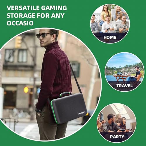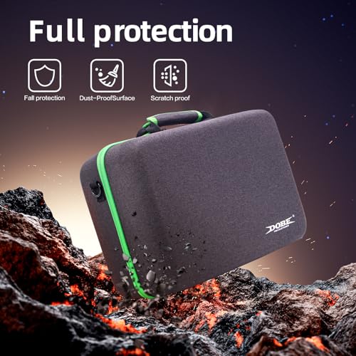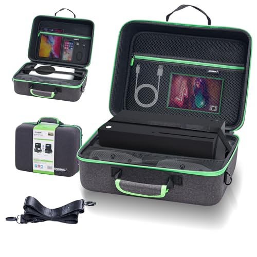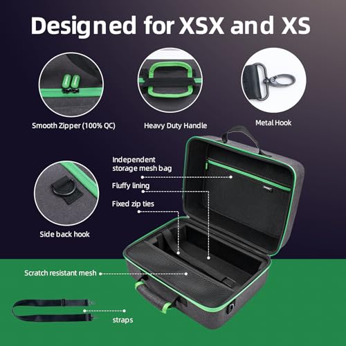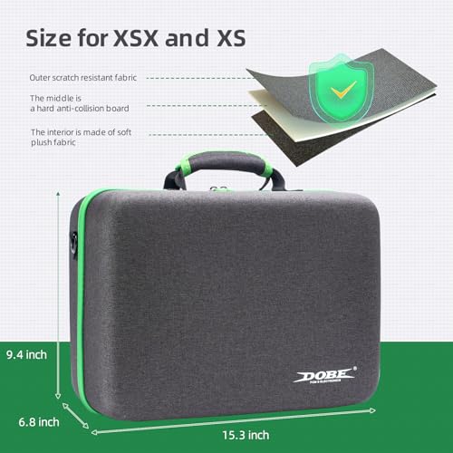2 IN 1 Xbox Carrying Case: The Pro Edition Travel Case Compatible with Xbox Series X or Xbox Series S Console; One carrying Case for two purposes, specially designed; Perfectly fit your xbox console, controllers, cables and other accessoriesCrashproof and Waterproof: This xbox hard carrying case made of EVA material, encase your xbox console and accessories in a composite hard shell interior for optimal defense from impacts and drops; Provide waterproof protection for your xbox console while preventing moisture and dust from entering. offering the best protection to your Xbox Series S/X game consoleShock-Absorbing Protection: This xbox carrying case is outfitted with thicken semi-soft compartments lining to keep your xbox console and game accessories from impacts and drops effectively during travel process; The fixing strap design of the fixed console and controller keeps the box inside stable. It protects your device all the time, even if the journey is bumpySTORAGE AND TRAVEL: Everything of the xbox gaming system will stay in custom compartments, with mesh fastening and zipper design to keep accessories organized; Definitely travel friendly! The hard shell and interior semi-soft compartments can provide double protection for the Xbox and accessoriesSpecial Design: Dimension:15.3 * 9.4 * 6.8 inch; The top padded handle and a detachable shoulder strap offer two carry ways; Double zipper allow you to put it in or out easily; You can carry your xbox game console anywhere to have fun