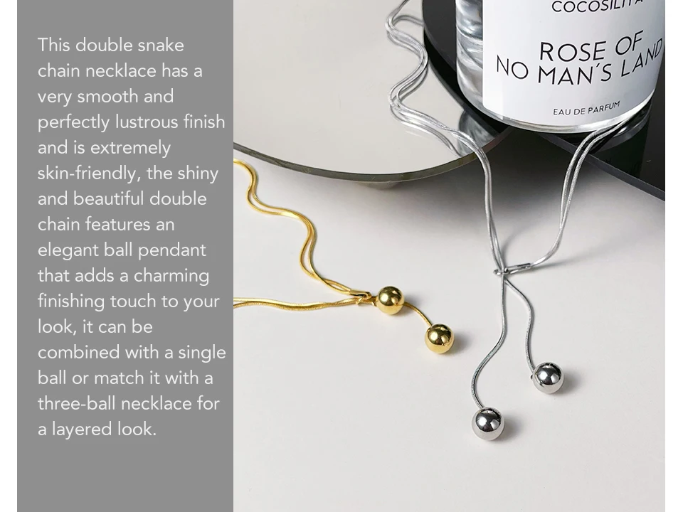 NOTE: This Double Snake Chain Necklace has a very smooth and perfectly lustrous finish and is extremely skin-friendly; the shiny and beautiful double chain features an elegant ball pendant that adds a charming finishing touch to your look; it can be combined with a single ball Or match it with a three-ball necklace for a layered look.