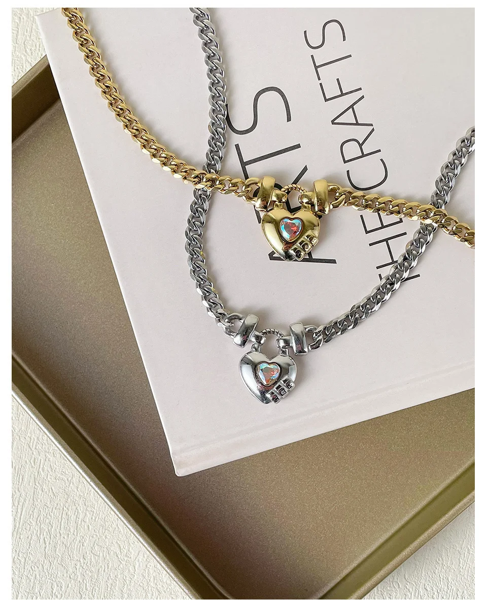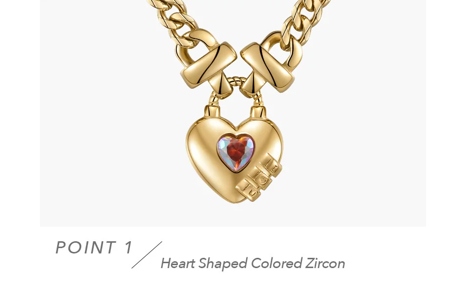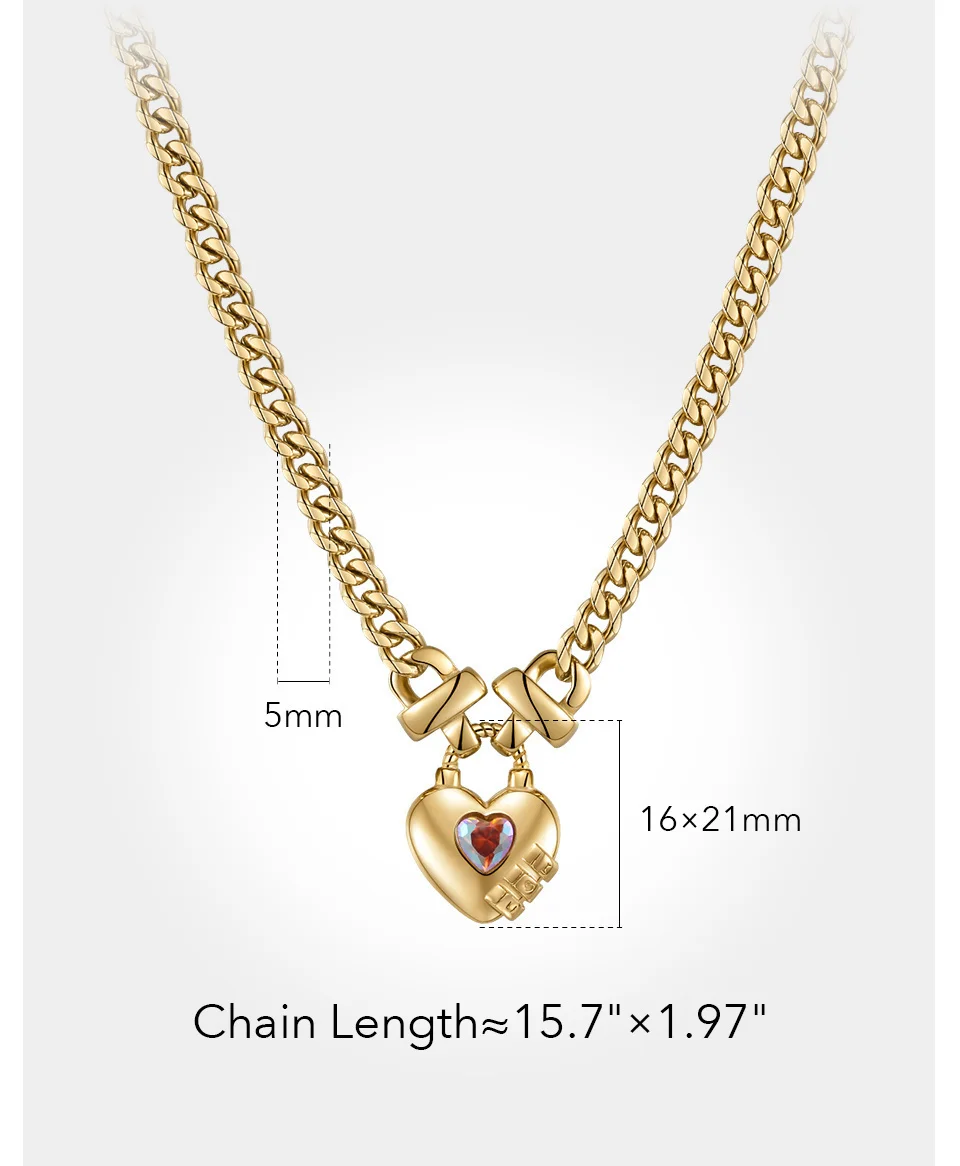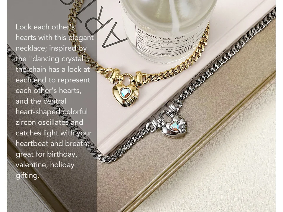 Lock each other's hearts with this elegant necklace; inspired by the "dancing crystal", the chain has a lock at each end to represent each other's hearts, and the central heart-shaped colorful zircon oscillates and catches light with your heartbeat and breath; great for birthday, valentine, holiday gifting.
