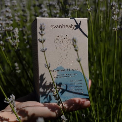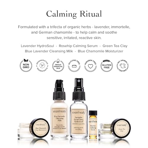 SKIN TRINITY - Contains 5 travel-size essentials for the evanhealy oil water clay ritual: Blue Lavender Cleasing Milk organic face wash, Lavender Facial Tonic HydroSoul, Rosehip Facial Serum ~ Blue, Blue Chamomile Day Moisturizer, and Green Tea clay face mask.FOR REACTIVE SKIN - Our core Blue line harnesses the balancing properties of soothing lavender and chamomile. This combination of brilliant botanical essences best mimics the skin’s natural moisture barrier to soothe reactive oily, damaged dry, and sensitive skin.EVERYDAY ANTI AGING SKIN CARE SET - The cleanser, facial toner, anti aging serum and hydrating moisturizing cream visibly reduce the appearance of fine lines, wrinkles, and hyperpigmentation to promote glowing skin and an even skin tone.BLUE ROUTINE - Begin with the gentle milk cleanser for face, followed by a generous spritz of the hydrosoul. Layer the rosehip serum on top, pressing into the skin, and seal it with the moisturizer. Apply the clay mask weekly, or as needed as a spot treatment and pore minimizer.ORGANIC SKIN CARE PRODUCTS - All evanhealy products are 100% gluten-free, non-GMO, fair trade, and cruelty free. We proudly formulate skin harmonizing essentials that are paraben free and free of synthetic fragrances.