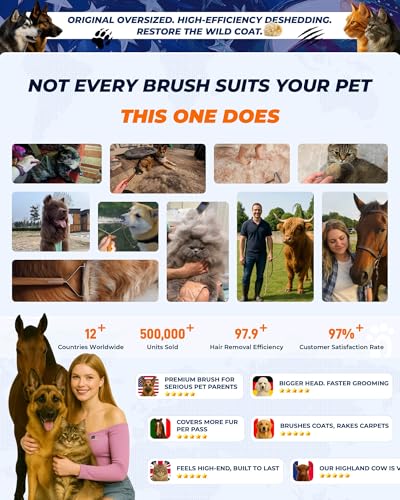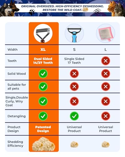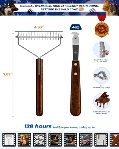 ☀️【Reduce Shedding Significantly】KIZO ESLO️ double-sided shedding tool quickly demat and detangle pet undercoat rake and effectively reduces shedding by up to 97.9%, keeping your home cleaner and your pet's coat in excellent condition. Perfect for use during shedding season.?【Safe and Comfortable Design】With rounded stainless steel teeth, this double side coat rake deshedding brush gently glides through your pet's fur without pulling or causing discomfort. Ensure a safe and pleasant grooming session every time.⏰【Quick and Efficient Grooming】Save time with our versatile grooming tool. The dual-sided design features a wide-tooth side for tackling tough mats and a fine-tooth side for deshedding and thinning, making grooming faster and easier.?【Ergonomic Handle for Comfort】The handle of this pet hair brush comb is made of high-grade sapele logs from lumber, providing a comfortable and secure grip. Minimize hand fatigue and groom your pet with ease, ensuring a stress-free experience for both you and your pet.?【Lifetime Warranty Guarantee】Shop with confidence knowing that our pet brush comb comes with a LIFETIME WARRANTY. If you encounter any issues, KIZO ESLO️ offer a full replacement or refund. Your satisfaction is our top priority, ensuring you and your pet enjoy a superior grooming experience. Give it a try for your pet!