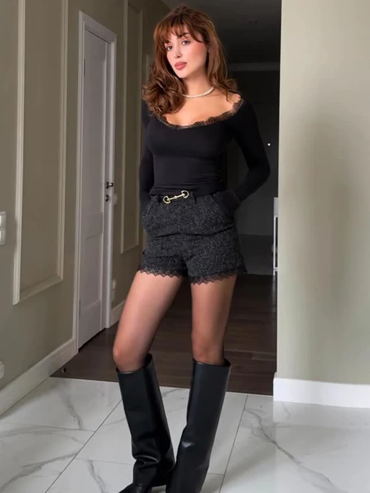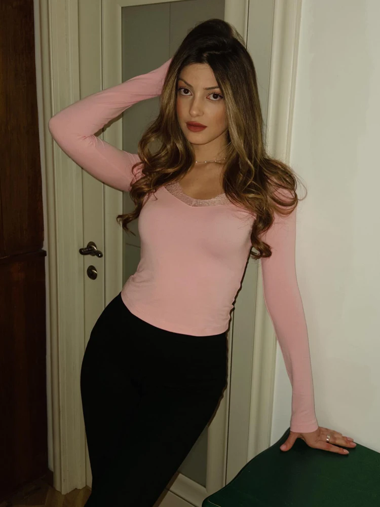 Fantoye Sexy V-Neck Lace Patchwork Women T-Shirt Winter Long Sleeve Ruched Elastic Slim Tees Streetwear Female Y2K Clothes 2026