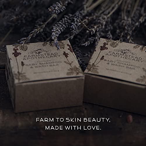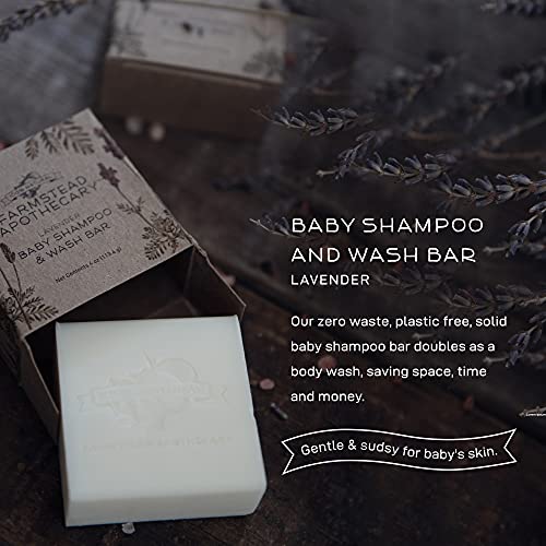 BABY SHAMPOO & WASH BAR LAVENDER - Our Baby Shampoo Bar doubles as a Body Wash to have your babies hair and body feel clean and purified by nature's natural ingredients. Our zero waste bar is plastic free, formulated for sensitive skin, made with 100% plant based, vegan, cruelty-free, and organic & non-GMO ingredients. This bar gives more uses than leading liquid baby shampoos and is the perfect eco-friendly alternative.FARMSTEAD APOTHECARY - We believe that it's not only important what you put in your body, but also what you put on your skin. Our skin absorbs a significant amount of the products we apply. When you're using synthetic products, you can bet that bad stuff is getting into your body. Using products like lotions, face wash, and hand soap builds up in your system . You can trust that you're putting truly wholesome natural products on your body, and no longer need to compromise on quality.INGREDIENTS YOU CAN COUNT ON - At Farmstead Apothecary we keep it simple by using minimal, purposeful, and skin nourishing ingredients only, and formulate our products for sensitive skin, so they can be used on all skin types. Our Products are cruelty-free, vegan, and gluten free.Baby Shampoo KEY INGREDIENTS - Non-GMO sodium cocoate, non-GMO vegetable glycerin, organic shea butter, organic jojoba oil, organic sunflower oil, organic lavandula oil, organic sodium gluconate, and sodium chlorideBABY'S SKIN WILL LOVE THESE GENTLE INGREDIENTS - Plant Based, vegan, cruelty-free, talc-free, specially formulated for sensitive skin