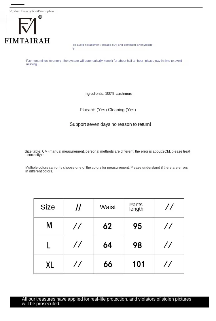 Note:1 inch=2.54 cm, ,so when you take the order ,please reference the size chart! Length:long pant Fabric: 100%Cashmere IF you not sure your size, please inquiry with us , we will do recomamnd the best size Cashmere introduction Cashmere is the fine undercoat fibres produced by cashmere goats Capra hircus. Due to the extremely cold winters the cashmere goat has developed an undercoat of remarkably thin hair fibres, which acts as an insulator and keeps the animal warm even at extremely low temperatures. Properties that characterize clothes made of 100% cashmere is that they are * remarkably soft and comfortable to wear * non-itching, as compared to a lot of other wool, and it may be worn directly onto bare skin even for newborn babies * warm and insulating when it's cold, whereas during high temperatures and summer the cashmere actually has a cooling effect * softened even more over time. You may wash your cashmere garment and it gets even softer and more comfortable over time Cashmere is collected during the spring moulting season when the goats naturally shed their winter coat. Everything is done manually, with no machines involved and it´s completely harmless to the goats.