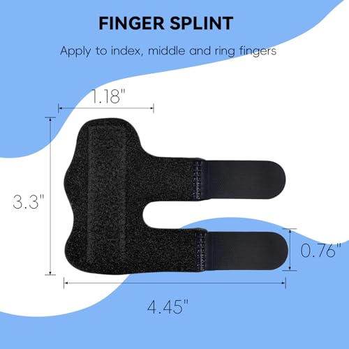 Pain Relief Finger Splint: Our trigger finger brace can effectively relieve finger pain caused by arthritis, tendonitis, swelling, sprains, mallet finger, etc.; Stabilize and immobilize the injured or fractured finger, speed up the whole healing process, and help your finger return to its original state.Quality Materials:Trigger finger splint is made of high quality styrene-butadiene rubber, elastic nylon and soft sponge composite fabric carefully, soft and comfortable. Built-in aluminum strips keep your fingers straight.Adjustable for Index, Middle and Ring Fingers:Velcro straps can be easily adjusted to ensure safety and stability. Can be worn by both men and women, left and right handed.Comfort and Portability: Finger brace is designed to be lightweight and easy to carry, our finger splint middle finger is perfect for use on the go or at home.Package Pieces: 2 black finger splints.Each of our finger splints is strictly tested and in a good working condition, if you find any quality issue, please contact us for exchange.