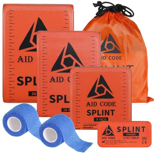 【Superior Support】Constructed with a robust aluminum alloy core encased between two layers of closed-cell foam, the Aid Code Splint ensures durability for both pre- and post-cast care.【Versatile & Adjustable】Easily customizable to fit any size requirement, the splint can be trimmed with standard scissors and reshaped as needed, offering flexibility and reusability for multiple injuries.【Waterproof & Convenient】Featuring a waterproof and easily sanitized closed-pore foam surface, this splint facilitates hassle-free cleaning and disinfection. Its radiolucent design allows for X-rays without removal.【Lightweight & Compact】This collection includes four splints of varying sizes (36" X 4.3", 18'' X 4.3", 9'' X 4.3", 4'' X 1.7"), two rolls of self- adhesive tape, and a cinch pouch. The self-adhesive tape, crafted for effortless wrapping and dressing, amplifies the effectiveness of the splints. Everything is neatly organized within the cinch pouch, providing a comprehensive and convenient answer for emergency needs.【Professional & Reliable】Trusted by EMS personnel, military medics, athletic trainers, ski patrols, wilderness rescue teams, outdoor adventurers, boaters, safety engineers, and various other professionals worldwide, the Aid Code splint stands as a testament to its reliability and professional-grade quality.