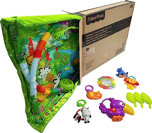 Link toys to mat or giraffe to encourage baby to push up on tummyRepositionable toys: Soft monkey, mirror, soft jingle lion, rollerball snail, clacker zebra and more!Satiny butterflies dangling overhead move at baby’s touchBaby's kicks and motion activate fun sound effects and musical dittiesInteractive toys, sounds, colors and textures help give baby’s sensory development a boost