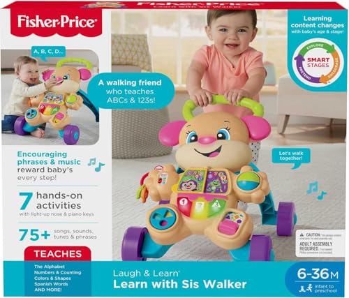 Musical baby walker with 2 ways to play as your child grows: sit & play or stand & walk3 Smart Stages levels with 75+ songs, sounds & phrases teach the alphabet, shapes, colors, numbers and Spanish words7 hands-on activities including light-up piano keys and nose, roller, spinner, flip page and moreEasy-grasp handle and sturdy, 4-wheel base helps steady baby's first stepsHelps strengthen fine and gross motor skills for infants and toddlers ages 6 months to 3 years old