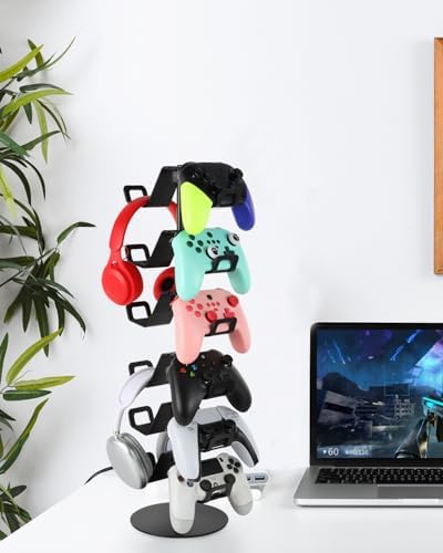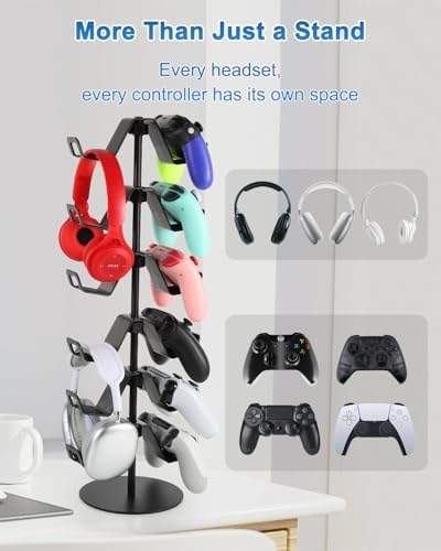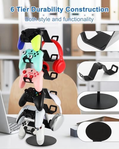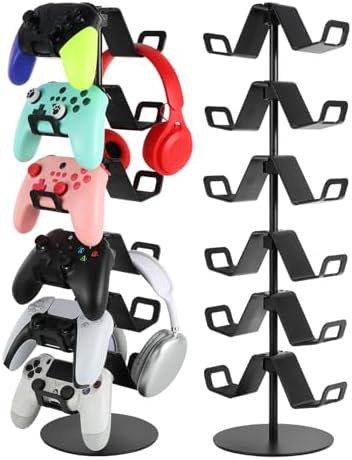 Sleek Space-Saving Design:Maximize your desk space with a vertical design that holds your gear without taking up valuable surface area. Our 6 tier controller headphone stand perfect for gamers who need to display their gaming setup in one space.Easy Assembly & Portable:Quick to assemble with no tools required. The controller headset stand is also easy to disassemble, making it convenient for gamers on the go or those who like to rearrange their setup.Wonderful Gift for Gamers: Whether for yourself or a gaming friend, this controller headphone holder is a thoughtful and practical gift that enhances any gaming environment.Making gift-giving effortless and impressive.Professional & Personalized Setup: Take pride in your setup with a organizer that not only improves functionality but also adds a professional touch.What You Get: 1xBase,1x3pipes,1x6Hangers.--Upgrade your gaming space now—Click “Add to Cart” and organize your setup in style!