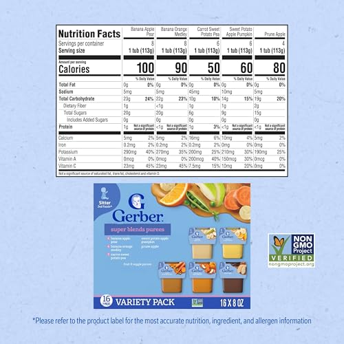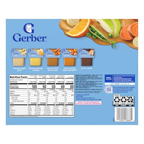 VARIETY PACK: This nutritious baby food variety pack comes with 5 fruit and veggie purees: banana apple pear, banana orange medley, carrot sweet potato pea, sweet potato apple pumpkin, prune appleSTAGE 2 BABY FOOD: These stage two baby purees are made for babies who are ready to explore new textures and flavors, making them a great addition to your baby's dietBABY FOOD PUREE: The fruits and veggies in this baby food variety pack have been pureed to ensure a smooth and enjoyable eating experience for your little one. With a convenient on-the-go packaging, our baby puree is something you and your little one will loveNO ADDED COLORS OR FLAVORS: This fruit and vegetable baby food puree has no added colors or flavors, and no added sweeteners or saltTRUSTED FAMILY FAVORITE: We are leading the way in quality and testing standards for babies. Our dedication to quality ensures that your baby receives the finest food available. Gerber baby food puree is a trusted choice for countless families