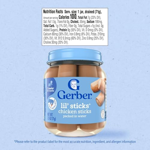 Gerber Mealtime for Baby Lil’ Sticks, Chicken Sticks, Packed in Water, No Nitrates or Nitrites Added, for Crawlers 10 Months & Up, 2.5 Ounce Jar (Pack of 10 Jars)