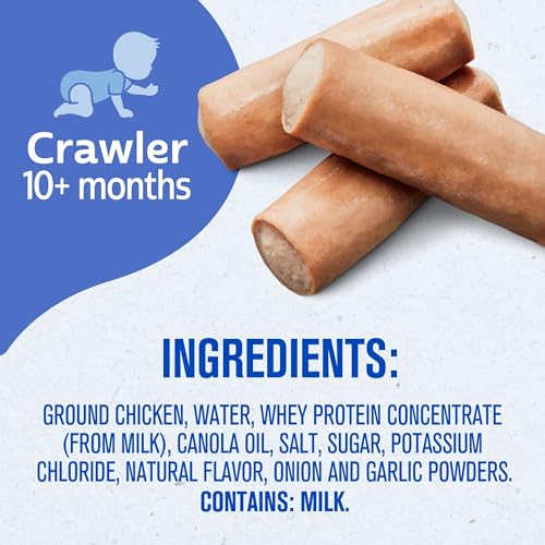 These Gerber Lil’ Sticks are made for Crawlers 10+ monthsEach servings contains 9g of protein; Excellent source of protein & zincMade with no preservatives, nitrates, or artificial flavorsGerber Lil’ Sticks are just right for toddlers learning to self-feedIncludes Ten (10) Glass Jars of Gerber Chicken Sticks