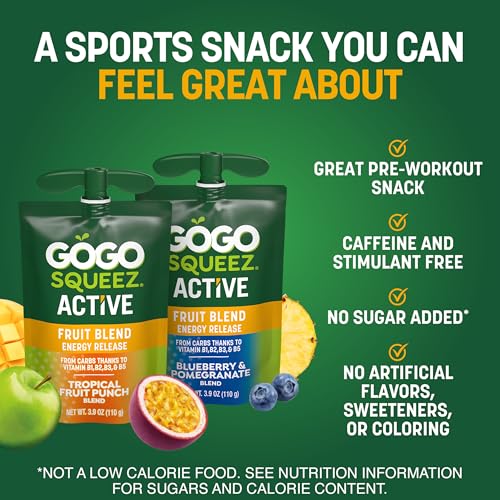 GoGo squeeZ Active Fruit Blend Energy Release , 18-Count Variety Pack , Tropical Fruit Punch and Blueberry & Pomegranate , Made with Real Fruit and B Vitamins