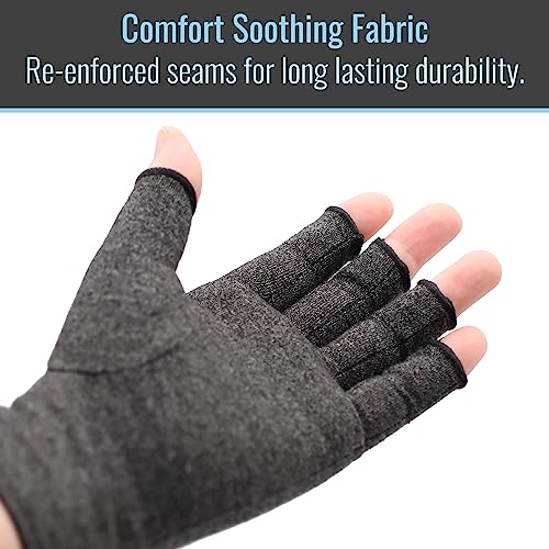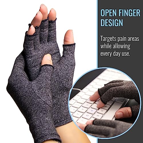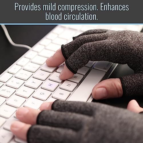 Form-fitting arthritis gloves designed for all-day use with soft and breathable material that applies comfortable compression for relief from arthritis carpal tunnel; other joint pain conditions.Open-finger design allows for gloves to be worn without inhibiting your lifestyle and activities. Perfect for phone use; sports; woodworking; cooking; typing; drawing; crocheting and so much more.Re-enforced seams and smart stitching make these gloves incredibly durable and allow for full range of hand motion.Washing is simple. Just wash in cold water and allow to air dry.44% Cotton/44% Polyester/12% Spandex
