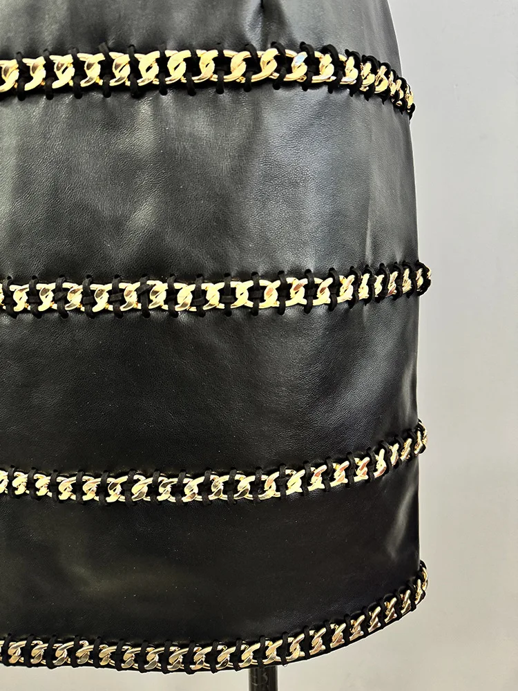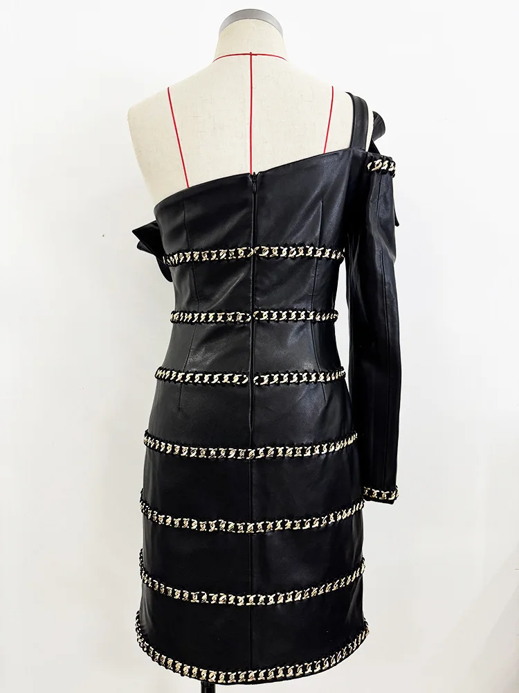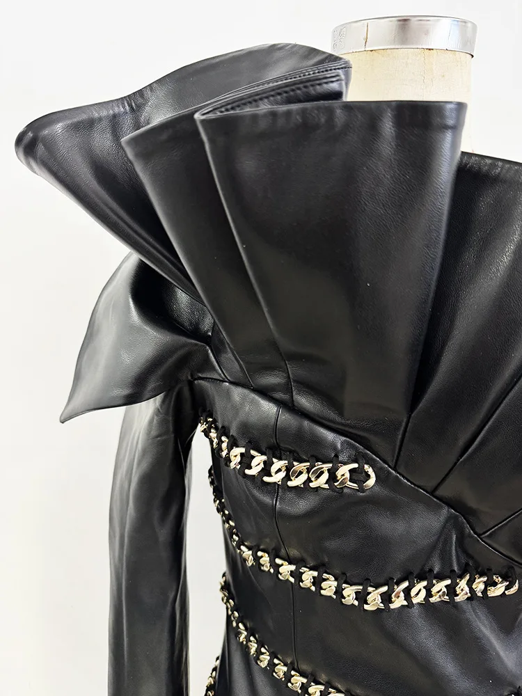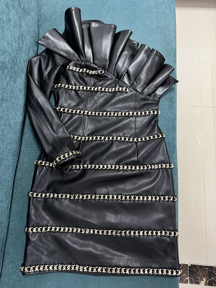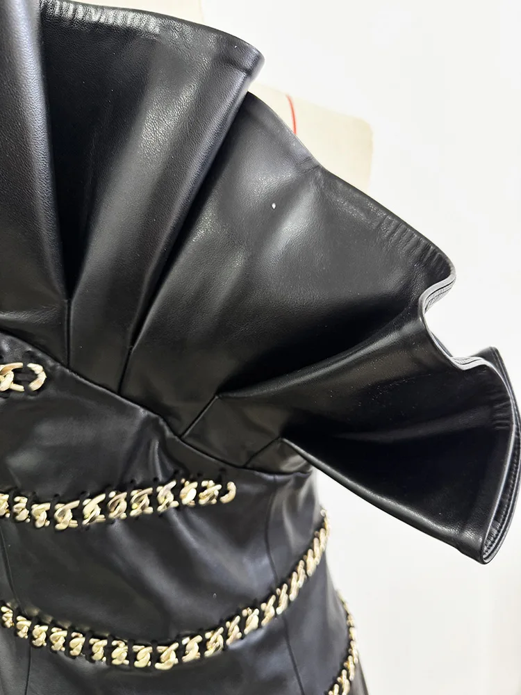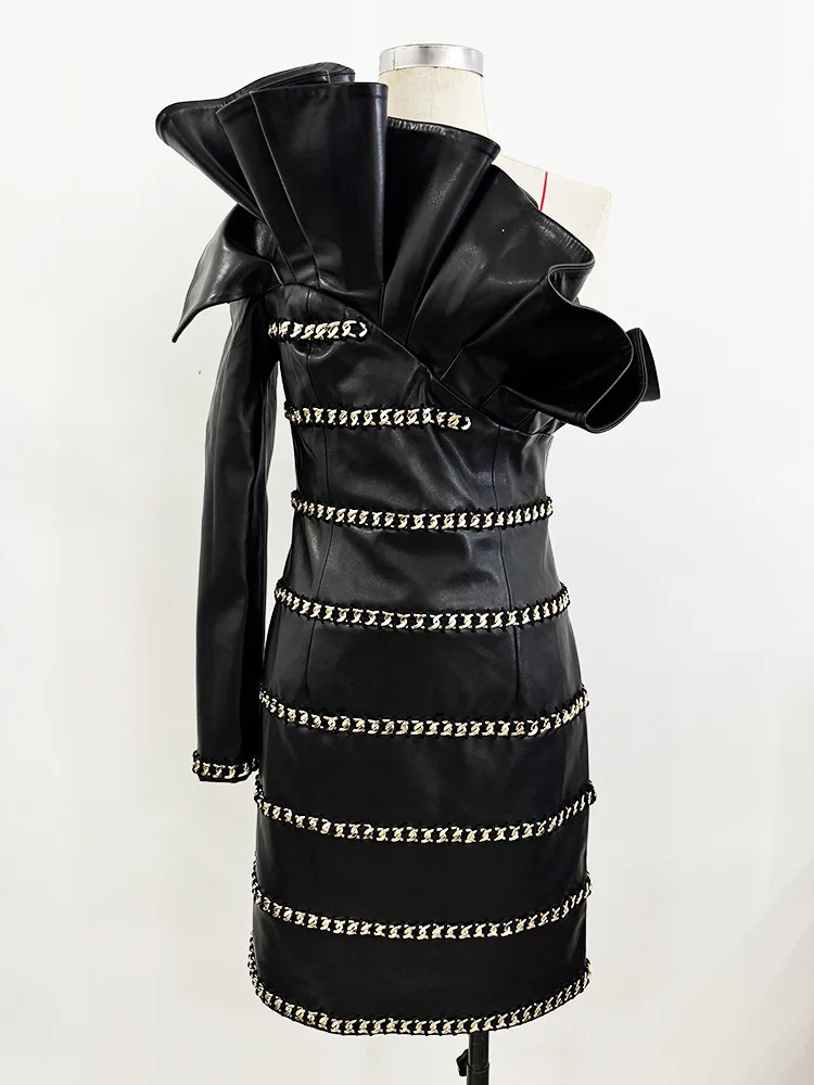 HIGH STREET Newest 2025 Designer Fashion Women's Chain Three-Dimensional Lotus Leaf Single Sleeve Leather Dress