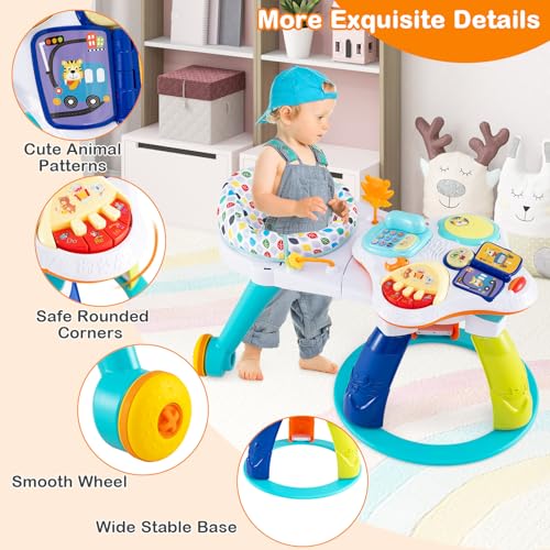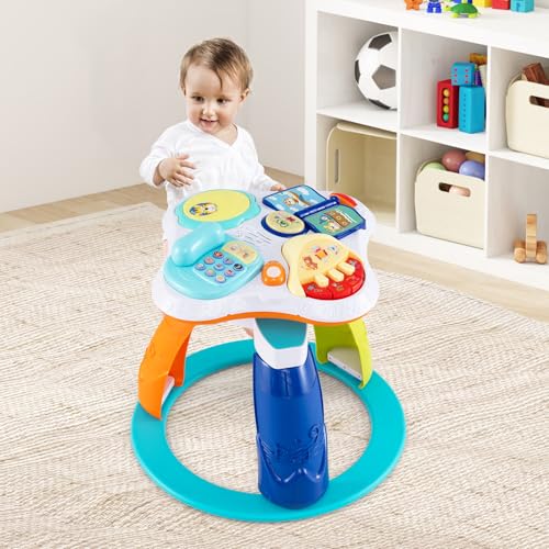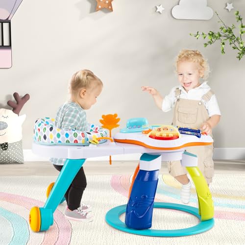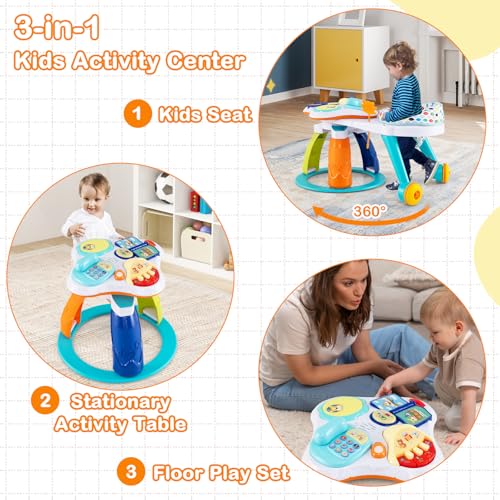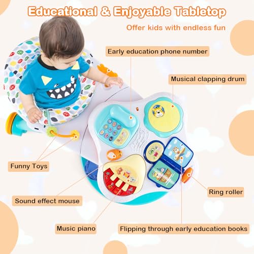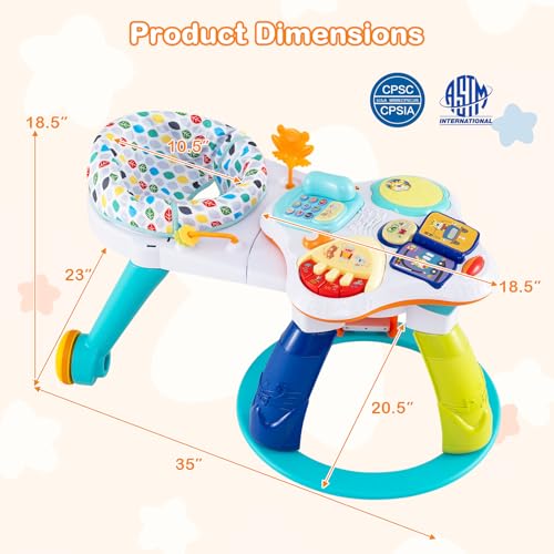 3-in-1 Kids Activity Center: This versatile HONEY JOY baby activity center is the perfect addition to any playroom or living space. As a 360° walk-around kids seat, the playset is equipped with two smooth wheels, allowing your kids to move around to play different toys. Meanwhile, it can be split into a stationary activity table or a floor play set for more convenient use. Plus, multiple fun toys helps stimulate babies’ sensory development.Educational & Enjoyable Tabletop Toys: As a developmental toy, this baby activity saucer promotes learning through play, improving baby's cognitive ability, color perception, brain development, and hand-eye coordination. The tabletop features various interactive elements including a music piano, a musical clapping drum, a pretend phone toy and a flipping through early education book, a ring roller, and a sounded effect mouse, which offer kids with endless fun.Height Adjustable & Detachable Seat: Thanks to the 3 gear adjustable seat positions, you can find the most suitable seat position for your little one as they grow up. The seat cushion is very soft and breathable, giving your baby an extremely comfortable experience. Besides, the seat is also easily detachable for easy maintenance, saving your energy and time.Attractive Appearance & Safe Frame: The activity center for baby is adorned with cute animal patterns and fun toys that are sure to capture your child's attention. Additionally, this activity center is designed with rounded corners and a wide stable base to keep your baby safe and ease.Perfect Kids Gift: This infant saucer activity center offers endless play options to keep your child entertained and learning. Designed for toddlers from 6 months to 3 years old, this standing activity center is an ideal gift for baby showers, birthdays and other holidays. Overall dimensions: 35” x 23” x 18.5” (L x W x H)