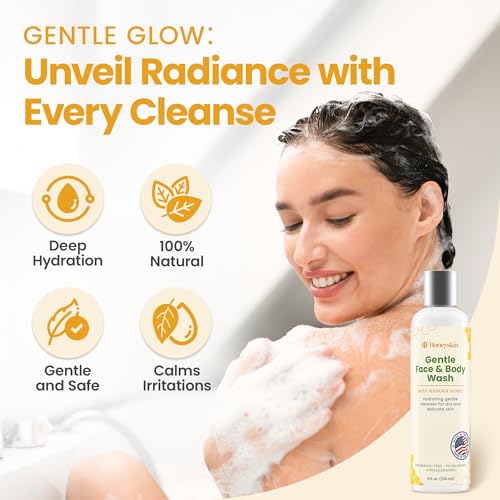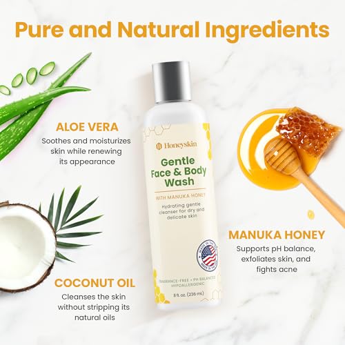 GENTLE, DEEP CLEANSING FACE AND BODY WASH - Honeyskin organic body wash & gentle face cleanser for dry skin gently yet thoroughly cleanses skin without stripping out natural oils, leaving skin feeling clean, soft, & healthy. This cleanser face wash also helps soothe & calm dry, itchy, or irritated skin.HYDRATE, NOURISH, AND RESTORE - This skin cleanser & acne face wash also provides an extra boost of hydration while deeply nourishing your skin from within. Our unscented body wash is formulated with pure, clean, & skin-loving ingredients to rejuvenate damaged & compromised skin.NEW ZEALAND MANUKA HONEY + NATURAL INGREDIENTS - Our in shower moisturizer & fragrance free body wash is infused with Manuka Honey from New Zealand, the most potent honey on earth that deeply moisturizes your skin. This acne body wash also contains aloe vera, cehami, orange oil, & more!PH-BALANCED AND MULTI-ACTION FORMULA - This mens & womens body wash is pH-balanced to mimic your skin’s natural pH level, making it perfect for all skin types. Our sensitive skin body wash also helps fight visible signs of aging while helping reduce the appearance of dark spots, acne marks, & hyperpigmentation.RESPONSIBLY SOURCED, MADE IN THE USA - Our sensitive skin face wash is made with you in mind. This body wash for women & men is formulated WITHOUT parabens, sulfates, & other potentially harmful chemicals. Honeyskin clean body wash is cruelty-free & 100% made in the USA.