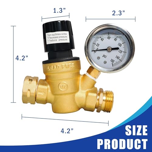 Upgraded Adjustable Handwheel: In contrast to conventional screw-adjustable RV water pressure regulators, this regulator features an enhanced adjustable hand wheel. No tools are required; simply use your hand to pull up the knob and turn it to adjust the water pressure.Lead-free Brass: The regulator is crafted from high-quality lead-free brass, containing less than 0.13% lead, which is significantly lower than the lead-free standard required by NSF. This ensures a healthier and safer RV experience.Easy to Use: With the ability to adjust pressure up to 160 PSI, this regulator allows for easy customization of water pressure settings. The pressure gauge provides clear visibility of the water pressure. Say goodbye to potential damage caused by excessive water pressure on your RV's pipes.Standard Size: Designed with a 3/4" hose female inlet and 3/4" hose male outlet, this regulator is compatible with all American water sources and RV hoses. Please note that leaks may occur due to faulty or missing gaskets.Wide Application: Equipped with a screened filter that effectively removes particles and prevents impurity blockage, this regulator is suitable for various applications such as home use, travel trailer camping, gardening, plumbing systems, etc.