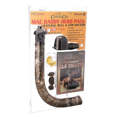 ALL-IN-ONE ELK CALL KIT - Mac Daddy Herd Pack includes Mac Daddy call, Estrus Squeeze Me, Premium Flex double-reed diaphragm, and instructional DVD, providing versatile and realistic elk vocalizations for any hunting scenarioMAC DADDY WITH INFINITY LATEX - Delivers authentic bugles and nasal cow calls with easy-to-use design, making it perfect for both beginner and experienced elk hunters looking for precision and consistencyESTRUS SQUEEZE ME - This call delivers a broad range of cow elk sounds, from piercing high-pitched fight’n calls to soft, subtle estrus whines and calf chirps. Featuring adjustable tone slots, it lets hunters fine-tune pitches for unmatched realismHANDS-FREE CALLING OPTION - Mac Daddy Herd Pack includes Carlton’s Premium Flex double-reed diaphragm for realistic cow and calf vocalizations while keeping your hands free during critical moments in the huntINSTRUCTIONAL DVD INCLUDED - Features “The Complete Elk Caller” with expert tips, calling techniques, and thrilling hunt footage from legends Wayne Carlton, JR Keller, and Al Morris to improve your skills