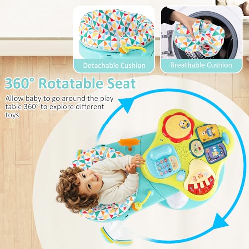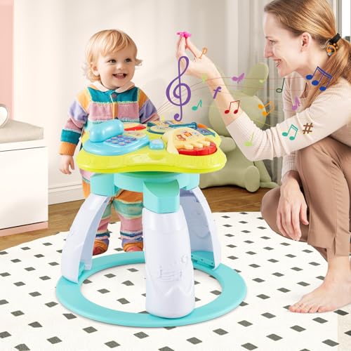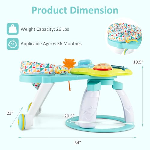 360°Mobile Seat: The baby mobile activity center is suitable for babies aged 6 months and older, as children enjoy being on the move. Kids sit on the comfortable exploring seat and use their little toes to walk 360° around the table! This allows babies to explore different fun toys while practicing walking, helping to cultivate kids sense of balance and motor skillsMultiple Interactive Toys: This baby jumper activity center is equipped with a variety of fun toys, including a telephone, mini piano, flip-over book, drum, oval ball, rolling bead toys, and music button. Each press, flip, drum, and rotation triggers the baby's curiosity. Additionally, the game table is spacious enough for multiple children to play and explore together Please note that the music tray requires 3 AA batteries (not included)3 Adjustable Heights: The baby walker features 3 adjustable heights, with the seat positioned at 8.5”, 9.5”, 10” from the ground to accommodate babies. Parents can easily adjust the height using the buckle located under the seat, making it convenient to customize the balance walker according to the baby's heightEasy to Disassemble & Clean: The seat of the activity center for baby is made of soft material, providing the newborn with a comfortable sitting position. Meanwhile, the removable seat cushion is machine washable, ensuring a clean and cozy environment for the babyCompliant with US. CPSIA and ASTM Requirements: Made of non-toxic materials without any odor, FREE from BPA, PVC, Phthalates, Lead, Latex, and Formaldehyde. No sharp points or edges. Passed the tests of stability, asphyxiation, load, and shear