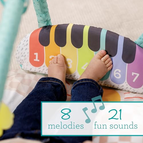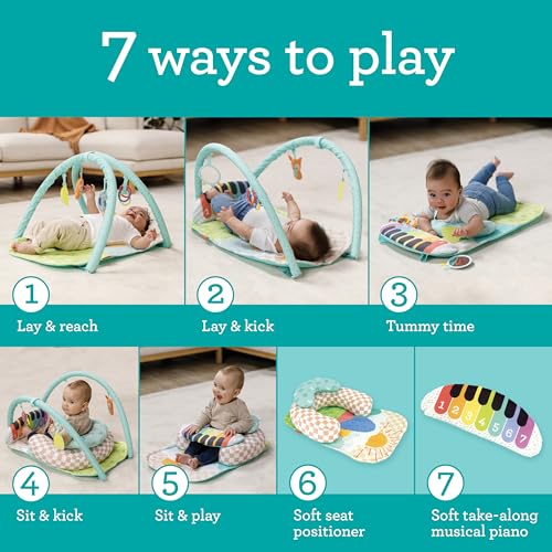 NO MORE OUCHIES: Our premium soft activity gym offers baby-friendly softness all-around, perfect for your little one's sensitive skin and growing body. It's the ideal way to play in comfort!ALL-INCLUSIVE PLAY GYM: Includes one playmat, one take-along musical piano, one seat positioner, one tummy-time bolster, and four hanging toys. It keeps babies entertained with seven melodies and 21 fun sounds, plus a composer mode for endless music-making possibilitiesFUN LEARNING THROUGH PLAY: Supports a range of developmental skills for growing babies, such as sensory exploration, hand-eye coordination, cognitive thinking, and more. Various modes from infant to toddler align with critical transitional developmental skillsOFFERS A SAFE & SECURE SPACE: A C-shaped seat positioner creates stability allowing your little one to sit up with confidence during playtime and tummy time while helping strengthen their back and neck muscles for eventually sitting unassistedDESIGNED WITH LOVE: At Infantino, we love babies, we adore kids, and we admire their moms and dads. We work hard to create products that guide development and bring joy as baby grows. Happy parents and little ones are what we are all about