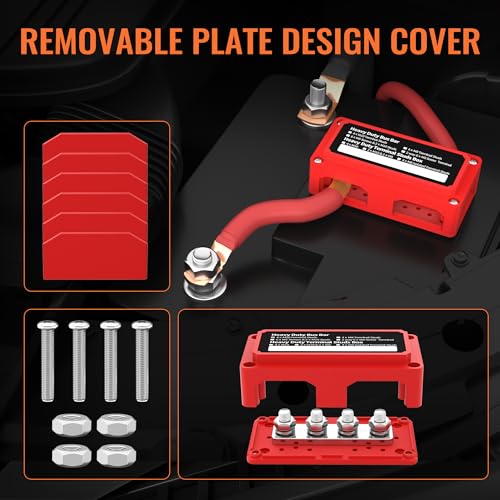 300A Heavy Duty: The 12V Bus Bar Box Rated 300A, besides, this power bus bar Junction block can work with MAX 48V DC & 300V ACSuperior Quality: Our marine bus bar 12v terminal block with 5.4" x 2.7" x 1.8" outer size, it features 7mm thicker copper bus bar plate with stainless steel studs and nuts which can be connected to wider range of cables. The product contains a red positive bus and a black negative(ground) bus in pairs3/8" Studs: The Power Distribution Block Bus Bar with 4 x 3/8" (M10) stud posts, which makes the 12V terminal block be able to accept 4/0 Gauge wires and terminalsWaterproof: The 12V junction block box with four side removable plates. You can remove the plates or drill hole on plate to let wires and terminals go through very easy and prevent short circuit, which makes your wiring more secure and reliableApplication: The 300A heavy duty battery bus bar makes the wiring of circuit become neat and tidy and prevent electric short circuit, suitable for 汽车用品, car, truck, marine, boat, RV, Solar, etc