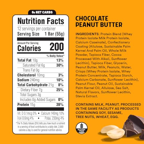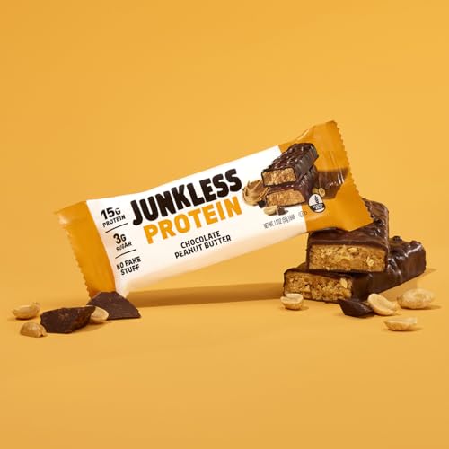 JUNKLESS Protein Bars - Chocolate Peanut Butter - 15g Protein, No Added Sugar, Gluten Free, High Fiber, Delicious Taste and Texture, Satisfying, Healthy Snack for Energy - 12 Bars