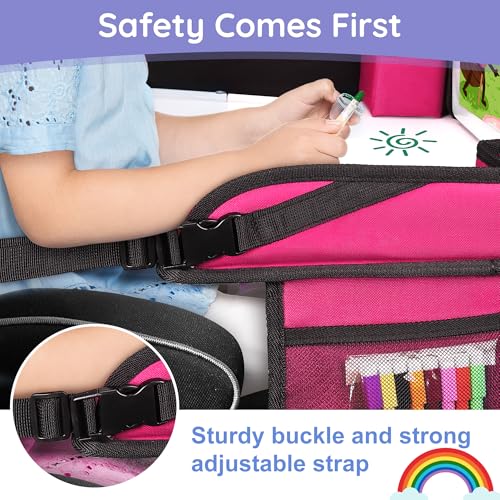 Kids Travel Tray, Kids Travel Trays for Car Seat, Road Trip Essentials for Toddler, Carseat Lap Tray with Dry Erase Board & Storage Organizer for Road Trip Activities for Kid, Pink