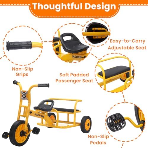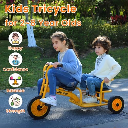 ADJUSTABLE SEATS AND PASSENGER SEATS: The front ergonomic seat of this double seat kids tricycle features forward and backward adjustability for optimal comfort, while the rear padded seat ensures a comfortable riding position. With its passenger seat design, your child can enjoy outdoor adventures with friendsTOUGH AND ANTI-ROLLOVER: This tandem tricycle for kids features a carbon steel frame with a yellow, powder-coated finish designed to resist rust. Since the sturdy steel frame tricycle is intended for children aged 2-8, we incorporated a stable triangular structural design to ensure safety and prevent tippingcaused by playful behavior or external forcesHARD-WEARING, AIRLESS TIRES: This preschool tricycle features non-slip, shock-absorbing rubber tires with a fully enclosed large wheel design to prevent pinching children's feet. The front big wheel significantly enhances the stability of the outdoor kids trike during steering maneuversKIDS APPROVED GIFT: This big wheel kids tricycle for ages 2-8 adventurers is the perfect gift for birthdays, Christmas and special holidays that will grow with your child! It is preschool, playground riding activity, homeschool, daycare, classroom and kindergarten outdoor kids play equipmentEASY TO ASSEMBLE AND MAINTAIN: Simply follow the step-by-step installation video provided on the product page for quick and efficient setup. Please feel free to contact us if you have any questions after receiving the product, we will be happy to help you solve the problem. Within 1 year, if any accessories are damaged in the process of use, you can contact us for free replacement parts