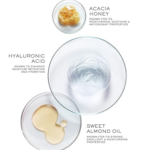 INGREDIENTS - Hyaluronic Acid is known for its potent ability to enhance skin’s water retention and improve skin elasticity. Acacia Honey brings moisturizing, soothing and antioxidant properties. And Sweet Almond Oil has strong emollient capabilities.