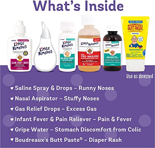 Everything you need to safely and effectively relieve your baby’s most common symptoms like runny noses, fevers and upset tummiesSafe for newborns6 baby essentials in one amazing baby shower giftProducts include: Little remedies saline spray / drops for noses, 0.5 fluids ounce; Little remedies nasal aspirator; Little remedies gas relief drops for tummies, 0.5 fluids ounce; Little remedies infant fever & pain reliever, 2 fluids ounce; Little remedies gripe water for tummies, 2 fluids ounce; Boudreaux’s Butt paste original diaper rash ointment, 2 ounceGreat baby gift for any new parent