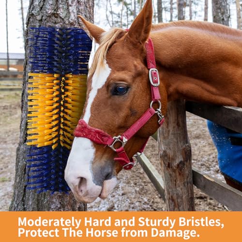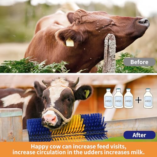 Attractive Colors for Cow: The livestock scratching brush is designed for alternating blue and yellow colors to attract cows to scratch. Studies shows that cows have limited color vision, can only perceive bright blue and yellowIncrease Milk Production: The livestock scratch brush can effectively alleviate insect bites, dead skin and dirt to keep healthy. Cattle scratcher brushes can promote blood circulation, reduce stress and increase milk productionHigh quality material: The cattle scratcher is made of high-quality nylon. Soft bristles can ensure durability and allow livestock to scratch safely, and the half-cylinder is enough firm to support livestock long time scratchingA Variety of Animals: Suitable for a variety of animals, such as cattle, sheep, horses, deer, pigs, etc. The cattle brush can help to pass through their hair smoothly. Cow brush help remove hair, prevent skin problems, improve circulation, and relieve stressEasy to install: 2PCS livestock scratcher and 4 screws included. The horse brush can be easily installed on tree stumps, fence posts and other places, to prevent animal from rubbing against fences, equipment, or buildings