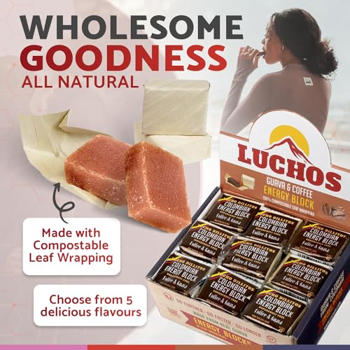 Please Note: Expiry dates on packaging are in UK format: DD-MM-YYYY NATURAL ENERGY BOOST WITH FLAVOR: Savor the rich, authentic flavor of Colombian Tropical Guava with LUCHOS Energy Blocks; delightful vegan energy bars that are available in five tantalizing flavors: Classic Guava, Acai Fruit, Coffee, Orange, and RaspberryNUTRIENT-DENSE POWER BAR: These energy protein bars deliver a powerful blend of carbohydrates, vitamins, and minerals; ideal high energy bars and pre workout bars for sustaining energy throughout intense workoutsIDEAL FOR ATHLETES: Trusted by top cyclists, these sports nutrition bars are ideal for various activities; they serve as healthy energy bars for runners, hiking energy bars, energy bars for cycling, and pre workout energy bars to boost your performanceCONVENIENT SNACKING ANYWHERE: These power bars are the epitome of convenience; their soft, easy-to-eat texture makes them the ideal on-the-go energy snacks for athletes; each block is individually wrapped in sustainable leaf packagingGENTLE ON YOUR STOMACH: With their natural, filler-free formulation, LUCHOS Energy Block are easy on the stomach, ensuring quick absorption; they're an excellent choice for those who need bars that are kind to sensitive digestive systems