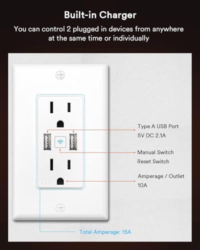 Quick and Easy Installation: This wall outlet with USB ports is easy to install and fits seamlessly into your home. Simply insert the neutral wire and the live wire into the corresponding holes on the back, then tighten the screws. Install the ground wire in the designated location at the backTamper Resistant Outlet: Our tamper-resistant smart electric outlet offers advanced protection against short circuits and overheating, ensuring the utmost safety for your family. With FCC certification and adherence to strict safety standards, you can trust this outlet to safeguard your home. Keep your playful and curious children protected while elevating your living space with our reliable and secure Smart outletSleek & Space-Saving Design: The compact and modern design seamlessly complements any room decor, eliminating the need for bulky power strips and providing a neat and tidy living spaceEco-Friendly & Energy-Efficient: Reduce energy waste by turning off standby devices, contributing to a more eco-friendly lifestyle and cost-effective utility billsWide Compatibility: Compatible with most home appliances and devices, this standard Wi-Fi Smart outlet is perfect for users looking for a hassle-free and versatile Smart home solution