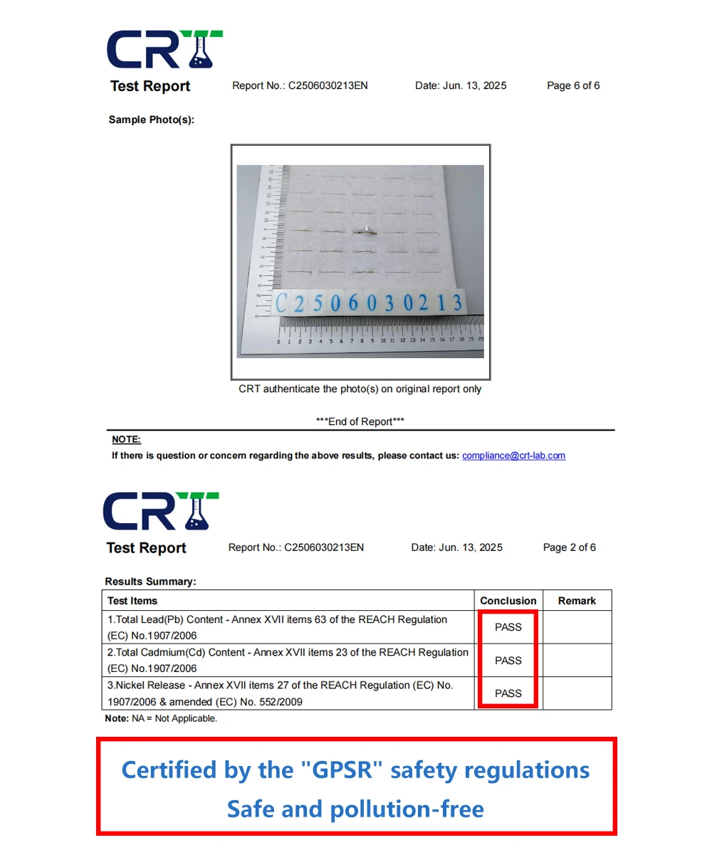 Hypoallergenic, tarnish-resistant, support testing by any third-party organization.