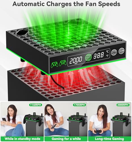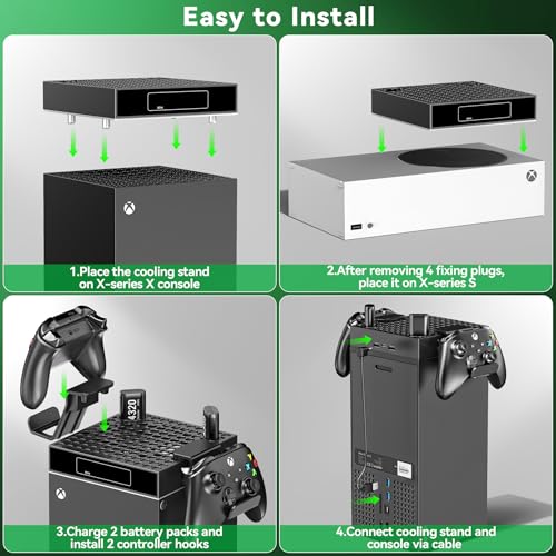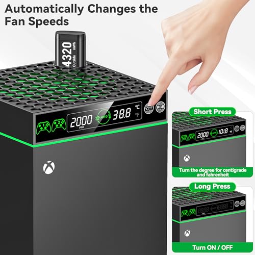 Built-in Advanced Stepless Fan:Xbox Series X cooling fan automatically and accurately adjusts speed based on temperature, ensuring that Xbox cooling fan always operates silently within optimal temperature range. Providing more flexible and efficient cooling solutions not only extends the lifespan of xbox console, but also saves energy. The screen display real-time temperature and RPM, and touch button will allow you to switch between Celsius and Fahrenheit.2 Packs 4800mWh Xbox Batteries:The package includes two Xbox rechargeable batteries. PLEASE REFER TO THE IMAGES TO GET THE CORRECT BATTERY INSTALLATION DIRECTION.There are two charging slots on the top of the Xbox cooling stand. Just gently place the batteries into the slots to start charging. The controller icon on the screen clearly shows the battery charging status-red indicates the battery is charging, and green means the battery is fully charged or stand by.Very Simple Installation Method:Install the 4 fixing plugs at the bottom of the Xbox fan, then place the Xbox cooling stand on the X-series X console. Alternatively, you can remove the fixing plugs and let the Xbox fan cool the X-series S console. Next, charge the 2 batteries, clip the controller hooks into the slots, and organize your controllers. Finally, use the cables included in the package to connect the running console to the Xbox fan.Control Method: This cooling fan has 9 RGB light modes, 2 breathing lights, and 7 monochrome light modes. The touch buttons for the fan and RGB lighting have two unique operation methods, namely long press and short press. By long pressing this button, you can easily turn the device on or off; while the short press operation is specifically designed for convenient mode switching, bringing you different usage experiences.Perfect for Xbox Gamers:The Xbox cooling fan, compatible with both Xbox Series X and Xbox Series S, is quiet and efficient, offering a multi-purpose solution that combines cooling, charging, and storage. It is a must-have for any Xbox gamer. This makes it an excellent gift choice for friends, sons, husbands, or any Xbox enthusiast.