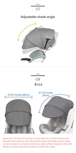 Made with premium water repellent cation fabric adds a bit of extra protection against rain and flexible plastic frames allows to easily fold in a provided storage pouch when not in use which is also convenient when traveling3 level shade length and angle adjustment provides flexible sun shade coverageSide to side: 15 3/4" (40 cm) Front to back: 27 1/2" (70 cm). (size is an approximate measurement and it may differ by approx. 1/2") Made in Korea❗Important before purchasing: The sun shade is intentionally designed with a soft, flexible frame to prevent breakage from external force or impact. While it’s not rigid by design, it’s enough to maintain its shape when properly installed on a car seat. Please watch the installation video to understand how it works and fits on different car seats.⚠️Compatibility: This item is not compatible with all car seats. Carefully read the product description, images, installation videos, and product reviews before purchasing.