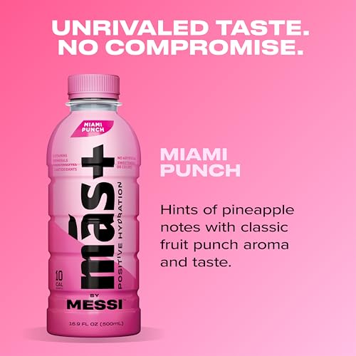 POSITIVE HYDRATION: Each 16.9oz bottle contains 1g of cane sugar and only 10 calories delivering a balanced blend of electrolytes, vitamins, minerals, and antioxidantsBALANCED: A balanced blend of electrolytes, (sodium, magnesium, potassium, and calcium), vitamins, (B3, B6, B12, A, C, E), minerals, (sodium, calcium, zinc, potassium, magnesium), and antioxidants, (C, E, A)UNMATCHED TASTE: Miami Punch has a balanced blend of berry flavors with pineapple notes for a refreshing fruit punch tasteNATURAL FLAVORS: No artificial sweeteners or colors, gluten free and caffeine freeHYDRATION FOR EVERYONE: Inspired by Messi himself to provide a hydration beverage for everyone, for any occasion