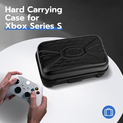 Carrying Case for Xbox Series S:This protective travel bag with precious cutout is specially designed for Xbox Series S console and controllers. Small compartment available for storing cables and other small accessoriesHard EVA Materials:Made of premium hard EVA materials. This case is of high quality and durability, offering the best protection to your Xbox Series S game console and wireless controllerUnique Design:The Xbox series s case is surrounded by padded liners. Besides, the corners of the upper and bottom cover is designed with anti-collision convex shapes, which can protect your game console more from impacts and bumpsGood Protection Function:This travel case will keep your Game Console from dust and effectively absorb impacts caused by accidentally dropping. The elastic string design of the fixed controllers keeps the box inside stable. It protects your device all the time, even if the journey is bumpyPortable & Easy to Carry:Double zipper design and with soft thickened handle. Easy to carry around, providing great comfort even over long distances
