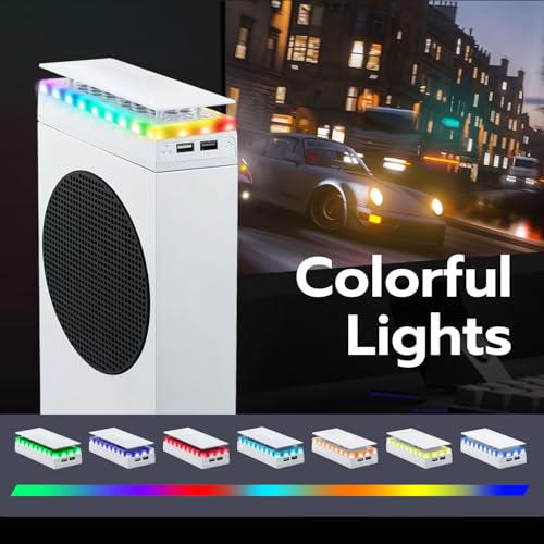 Special Design:High speed dual cooling fan with RGB lighting specially designed for Xbox Series S. 3 fan speed level available. Installed on the top of the console case allows to quickly draw and blow away the running heat of the console. Help to cool your console down in an effective way.Dustproof Design:Feature an ABS dust-proof cover prevents dust and foreign objects from falling into the fan and console. It also allows more heat to pass through and prolong the lifespan of console.With LED Lights:The built-in LED colored lights increase the sense of game atmosphere. 7 lighting modes available. Customize the lighting effect according to the games and make your console unique.Extra 2 USB Port:Extra two USB Ports to connect the mouse, keyboard, and other USB devices. One for charging only and the other one for both data transmission and charging.Attentions:Powered by USB 5V via console. No additional adapter or cables required. Compatible with Xbox Series S console only, NOT for Xbox Series X,Xbox One,Xbox One X,Xbox One S consoles.