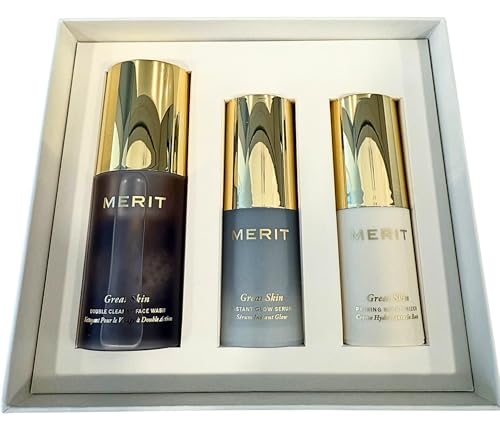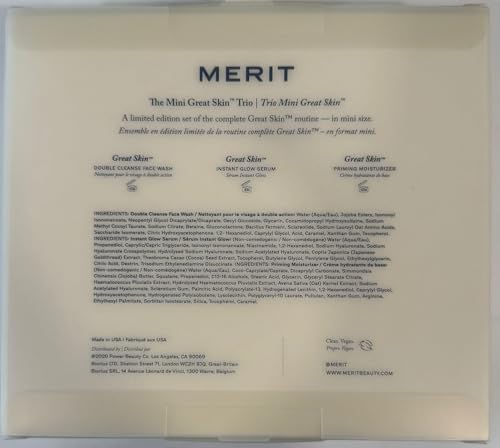 Complete Mini Routine – Includes face wash, glow serum, and moisturizer for a simple 3-step skincare regimen.Double Cleanse Face Wash – Gently removes impurities and refreshes skin with a lightweight cleansing formula.Instant Glow Serum – Provides a boost of hydration and radiance for visibly smoother, brighter-looking skin.Travel-Friendly Sizes – Convenient minis make this set perfect for on-the-go use or as an introduction to MERIT skincare.Priming Moisturizer – Lightweight yet nourishing formula hydrates and preps skin for makeup or daily wear.