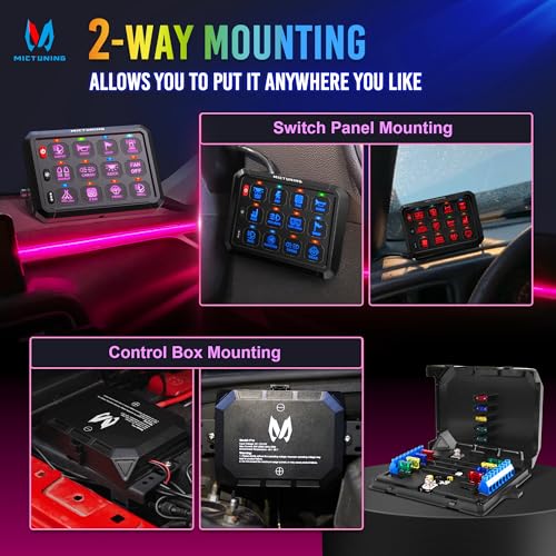 ★【3 SILICONE FUNCTION BUTTONS】MICTUNING P1B RGB 5 Inch 12 Gang Switch Panel designed with 3 silicone button which have a comfortable touch and are highly responsive, allow for blind operation. Including ON/OFF switch with memory function, Brightness Adjustment Button, RGB Color Button★【4 CONTROL MODES 】4 Different Colors represent 4 Different Control Modes: Red - Toggle, constant light mode. Green - Momentary ignition power, press and hold to turn on, release to turn off. Blue - Flash Light Mode, flashing at a lower speed which can be used for turn signal. Cyan - Pulsed Strobe Mode, used for emergency light or warning light. You can easily switch between modes in different situation★【BACKLIGHT OFF & 5-LEVEL BRIGHTNESS】 12v switch panel features a manual backlight off function, turn off backlight for a more comfortable visual experience and energy conservation. Also, there are 5-level backlight brightness (100%, 75%, 50%, 25%, 10%) to adjust according to the environment. Unlimited RGB backlight colors to match your vehicle's ambiance★【RELIABLE SWITCH POD】 Perfect for controlling multiple lights and accessories, makes wiring neater and easier. 12 gang Switch panel Rated at 960W/12V,1920W/24V, Maximum Current: 80A, Operating Temperature: - 40°C to 105°C, IP65 waterproof rate. Suitable for 12V/24V RV, marine, car, truck, off-road, ATV/UTV, boat, yachts, Caravans, etc★【Professional After-Sales Support】Our product comes with a two-year warranty. If you encounter any issues while using our product, feel free to contact us at any time. Our responsive team is on standby and committed to assisting you within 24 hours to solve your problems. You're not just purchasing switch panel but investing in peace of mind and continuous support